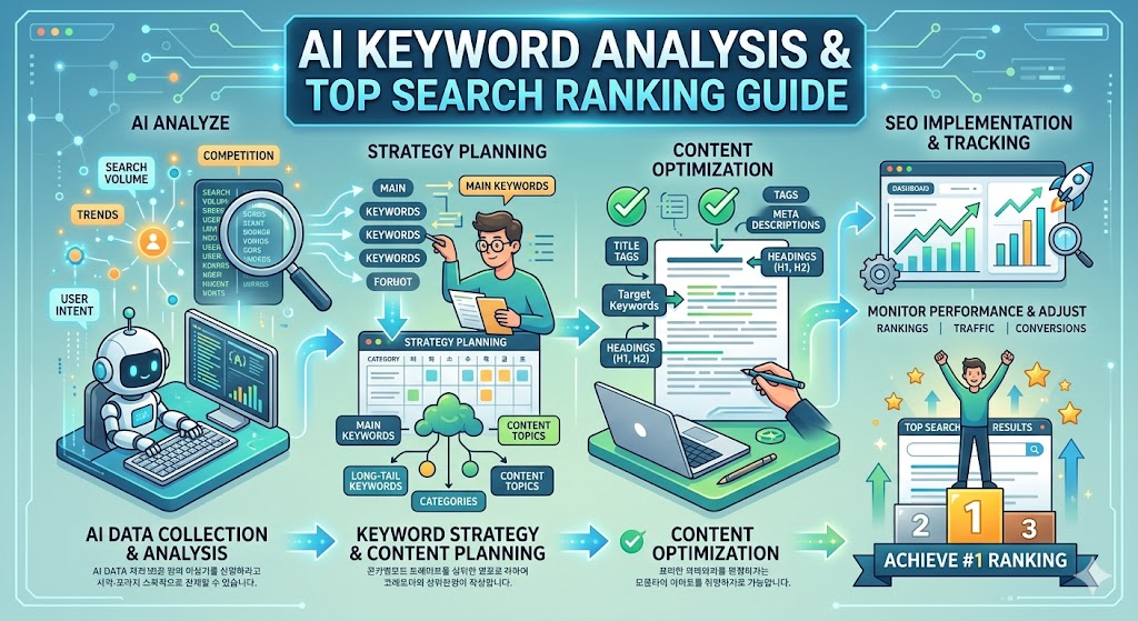 AI 키워드 분석은 상위노출의 지름길이 아니라 방향을 잡아주는 나침반과 같습니다. 올바른 키워드를 선택하고, 검색의도에 맞는 구조를 설계하며, 꾸준히 데이터를 분석해 개선하는 과정이 핵심입니다.